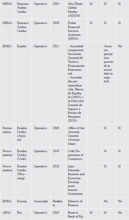 Cabe decir que la mayoría de las jurisdicciones evaluadas (55 de 61)8 cuenta en la actualidad con algún tipo de información en formato digital o portal web, e incluso con la posibilidad de presentar la documentación o las dudas en idioma inglés (consultas o temas relacionados con sandboxes regulatorios), eliminando posibles barreras idiomáticas para las partes interesadas de origen extranjero. En esta misma línea, la ley española permite la presentación de solicitudes en lengua inglesa; sin embargo, parece que las contestaciones por parte de la autoridad serán en castellano (Ley N° 7/2020, art. 6.4).