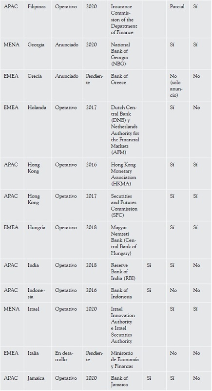 Si bien existen en la actualidad canales de comunicación entre el sector privado y el sector público, estos carecen de los elementos necesarios para promover una comunicación fluida y abierta que permita un mejor entendimiento entre las partes de las necesidades y expectativas de cada una. Por este motivo, las nociones de facilitadores de innovación (innovation facilitators), que incluyen centros de innovación (innovation hubs) y sandboxes regulatorios (regulatory sandboxes), se han popularizado entre los altos estamentos del mundo financiero (FSB, 2017, 2019; IMF, 2019; BID, 2018; Roeig, 2019; ESMA, 2018; Banco Mundial, 2020). Consecuencia de ello son los 57 sandboxes operativos y los 11 anunciados o en desarrollo a diciembre de 2020 para las 61 jurisdicciones observadas en este estudio (ver detalle en el Anexo 1).