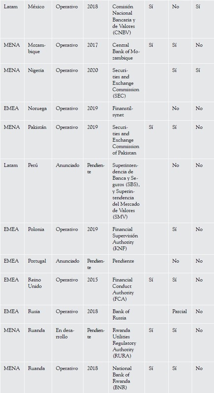 En el caso de España, en la actualidad la Comisión Nacional del Mercado de Valores (CNMV, s.f.) ya cuenta con un portal de innovación financiera, mientras que el Banco de España ya habilitó una sección en su página web en enero de 2021. Se espera que la Dirección General de Fondos de Pensiones (DGSFP) desarrolle una solución similar en los próximos meses. La nueva sección en la web del Banco de España permite realizar consultas relacionadas con cómo acceder al sandbox regulatorio mediante un enlace que permite a los usuarios entrar a conocer los detalles publicados por la Secretaría General del Tesoro y Financiación Internacional, a la vez que permite atender dudas normativas y de innovación tecnológica.