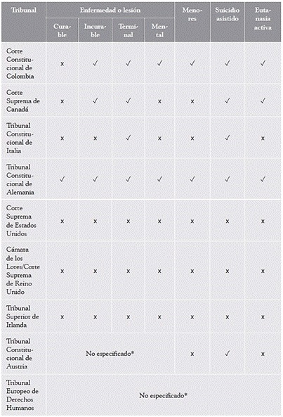 Hasta la fecha, los tribunales de Colombia (1997 y 2022), Canadá (2015), Italia (2019), Alemania (2020) y Austria (2021) han reconocido el derecho a la eutanasia o el suicidio asistido. En contraste, los tribunales de Estados Unidos (1997), Reino Unido (2002) e Irlanda (2013) lo han rechazado. Tanto el reconocimiento como el rechazo, sin embargo, suelen recaer sobre derechos con alcances muy distintos. Por lo general, los factores que causan mayor controversia, tanto para reconocer como para rechazar el derecho a la muerte asistida, son los relacionados con la naturaleza de la enfermedad y la edad de los pacientes, como detallo a continuación.
