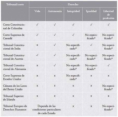 Otros tribunales han sostenido que la criminalización plantea mayores riesgos al libre ejercicio de la profesión médica. La Corte Constitucional colombiana ha señalado que la prohibición de la eutanasia, incluso en pacientes con enfermedades incurables (no terminales), limita injustificadamente la autonomía ética y científica de la profesión médica. La prohibición «genera un efecto disuasorio sobre los profesionales de la salud para un ejercicio ético y altruista de su profesión […] e impide al médico actuar en procura de la mejor situación o los mejores intereses del paciente» (Sentencia C-233/2021, 2021, § 403). De forma similar, el Tribunal Constitucional alemán sostuvo que «la prohibición de los servicios de suicidio asistido vulnera el derecho fundamental a la libertad de ocupación de los médicos», e incluso de los abogados (Ley Fundamental, 1949, art. 12.1). Más concretamente, sostuvo que la prohibición «interfiere en la libertad profesional de los médicos y abogados de nacionalidad alemana dado que les prohíbe, bajo pena de enjuiciamiento, conceder, procurar o concertar la asistencia al suicidio como parte de su ejercicio profesional como médico o abogado». Incluso, el Tribunal reconoce que, como parte de su ejercicio profesional, los abogados y médicos pueden ofrecer comercialmente servicios relacionados con la realización del suicidio asistido, sea como personas naturales o como personas jurídicas (BVerfG, Urteil des Zweiten Senats vom 26, febrero de 2020, § 320). La siguiente tabla sintetiza las conclusiones de cada tribunal sobre la violación de derechos fundamentales.