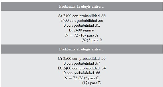 Así, en el problema 2 se enfrentan dos opciones probables y, por tanto, desaparece el efecto de certeza de una de las alternativas. En este caso, las personas terminan escogiendo la alternativa que representa el mayor valor esperado, aunque sea menos probable6. De este modo, se escoge igualmente la opción más segura en términos de resultados, no de probabilidades.