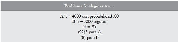 Kahneman y Tversky (1987) demuestran lo anterior en un ejemplo donde constaron que existe una preferencia por el riesgo de aceptar la alternativa de .80 de perder 4000 (opción A´) frente a la alternativa de una pérdida segura de 3000 (opción B´), aunque esta última posea un valor esperado menor que la primera (3200 > 3000)9; es decir, se escoge la alternativa sujeta a mayor probabilidad, aunque signifique una mayor pérdida esperada para el elector.