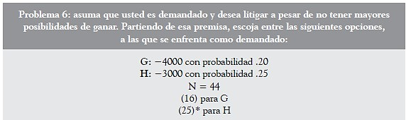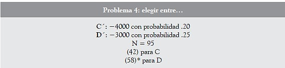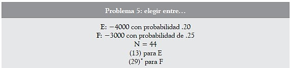 En efecto, las elecciones a favor de D´ en el problema 4 y de F en el problema 5 demuestran una propensión al riesgo, porque en ambas alternativas las pérdidas esperadas son menores ($ 2250) a las pérdidas esperadas de las alternativas C´ y E ($ 3200), escogiendo los alumnos entre alternativas probables de pérdida aquella menos riesgosa; es decir, aquella que implica una mayor probabilidad de pérdida (25 % > 20 %), pero con un menor valor esperado.