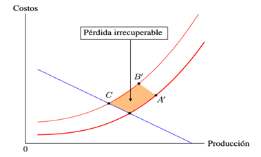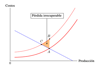 Entonces, la actuación del demandante produce la pérdida de bienestar social que hemos referido porque los costos no están compensados por beneficios. Tal pérdida de bienestar es irrecuperable y se manifiesta en el triángulo que se forma entre los puntos A, B y C.