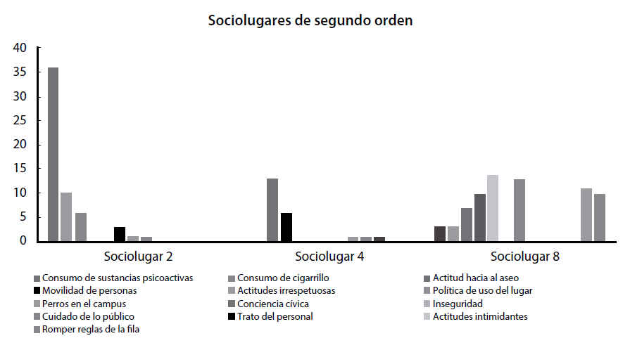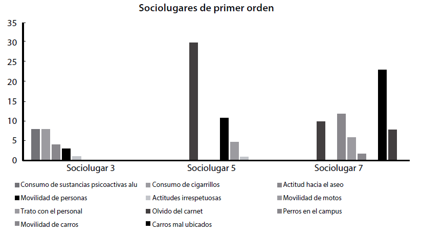 En la figura 5 se presenta la relación de los comportamientos en razón a la frecuencia obtenida, incluyendo en la figura únicamente los tres comportamientos con mayor porcentaje en cada sociolugar, con el objetivo de filtrar los de mayor influencia.