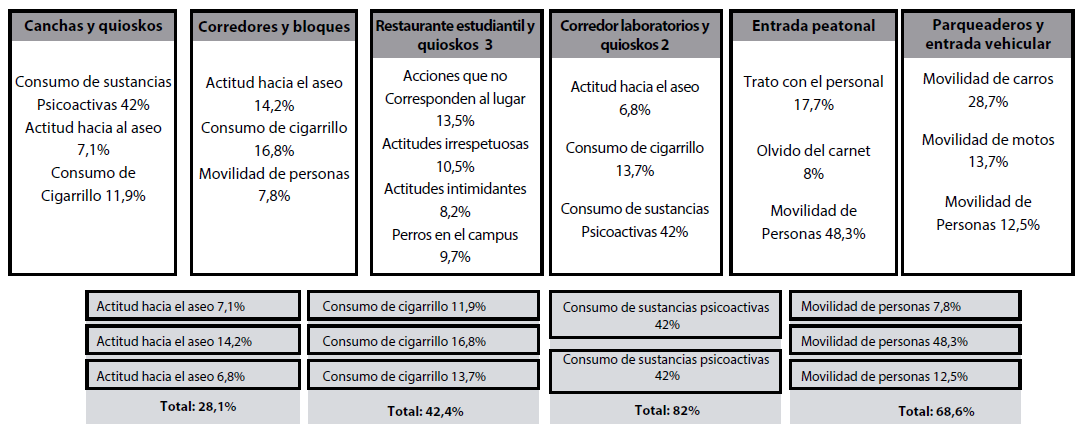 Los datos fueron agrupados para determinar los comportamientos comunes en más de un sociolugar, como se muestra en la figura 4, según el nivel de influencia, pues estaban presentes en diferentes actividades durante su convivencia en el campus. Así se obtienen como resultado los cuatro comportamientos de mayor afectación (1) consumo de sustancias psicoactivas; (2) movilidad de personas; (3) consumo de cigarrillo, y (4) actitud hacia el aseo.