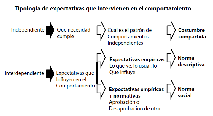 Dentro de las posturas teóricas del comportamiento, se resalta lo expuesto por Bicchieri (2019), al proponer un modelo para el diagnóstico del comportamiento a través del entendimiento de las razones por las cuales se adoptan cierto tipo de normas como elemento fundamental para el diseño de intervenciones, que busquen un cambio social. Debido a que muestran la naturaleza de los comportamientos colectivos, referidos a los patrones de conducta compartida por un grupo de individuos y porque las personas se involucran en ellos, aun cuando pueden ser contraproducentes. Cuando se busca cambiar o transformar una norma social es necesario conocer y analizar los patrones de comportamiento motivados por preferencias condicionales o expectativas sociales. Estas últimas responden la comprensión del porqué suceden, si corresponden a una acción independiente o interdependiente referida a (1) experiencias empíricas, como aquellas donde las personas actúan pensando en cómo otras personas lo harán en situaciones específicas y (2) expectativas normativas, actuando según lo que los demás piensan que se debe hacer en algunas situaciones; al determinar la importancia de la elección de una persona se puede identificar qué tan sensible es ante una norma específica. En este sentido, la autora plantea una clasificación de los comportamientos colectivos por medio de la medición de los factores causales y de los patrones de comportamiento, para determinar cuál es la naturaleza y el tipo de expectativas que median al adoptar un comportamiento para poder abordarlas en intervenciones futuras.