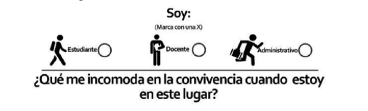 2. Opina: las personas tomaban la hoja de papel (figura 2), que a su vez era el instrumento de recolección de información. En este paso se debía diligenciar señalando con una X si eran estudiantes, docentes o funcionarios y responder la pregunta detonante.