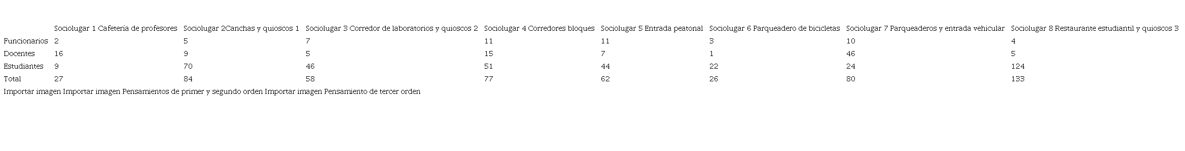 Esta práctica se implementó durante dos días, contando con la participación de 547 personas. Los datos obtenidos se clasificaron según el sociolugar y el tipo de actor (estudiante, docente y funcionario), los cuales se presentan en la tabla 1. Se encuentran señalados en color gris claro los sociolugares de primer orden, que son aquellos que tuvieron mayor número de opiniones en total, seguido de los señalados en gris oscuro, como los sociolugares de segundo orden, que tuvieron mayor número de respuestas por parte de un colectivo específico, y en blanco, los de menor número de opiniones registradas.