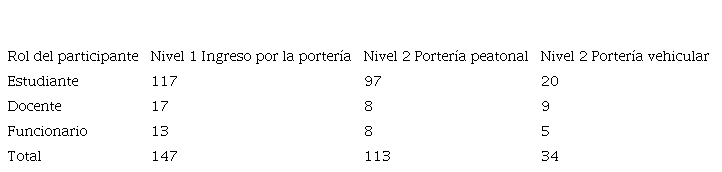 La experiencia de usuario de “Contra el tiempo” permitió construir una base de datos para analizar el tipo expectativas que motivan el comportamiento tanto al ingresar por la portería como al movilizarse por los pasillos y los parqueaderos del campus. Los datos recolectados corresponden a dos días de uso de la experiencia por parte de miembros de la comunidad, dentro de los cuales se contó con la participación de 147 personas. En la tabla 2 se presentan los datos generales, organizados según los roles y la elección de portería que escogieron los participantes.
