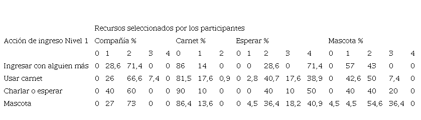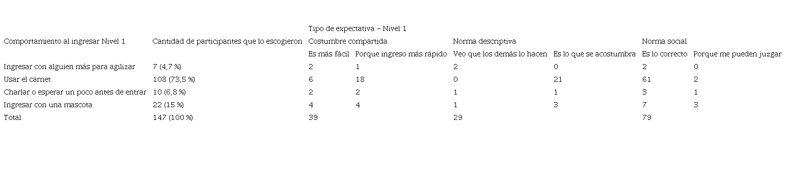 Ingresar con alguien más para agilizar: este último comportamiento del nivel 1, con un 4,7 % de preferencia, obtuvo un porcentaje igual en tres expectativas individuales distintas, por lo cual, se toma, para este análisis, el mayor porcentaje de expectativas al agruparlas según la clasificación del modelo, enmarcándose así en una costumbre compartida, a diferencia de los otros tres comportamientos de este nivel. Esto quiere decir que la conducta se genera al suplir una necesidad, por lo cual, es independiente al juicio y actuar del colectivo. Esto se ve reflejado en la selección del recurso “compañía” donde un 28,6 % lo recogieron una vez y un 71,4 % dos veces, como algo necesario para poder ingresar de forma más rápida, sin tener en cuenta una aprobación social o el cumplimiento de alguna normativa.