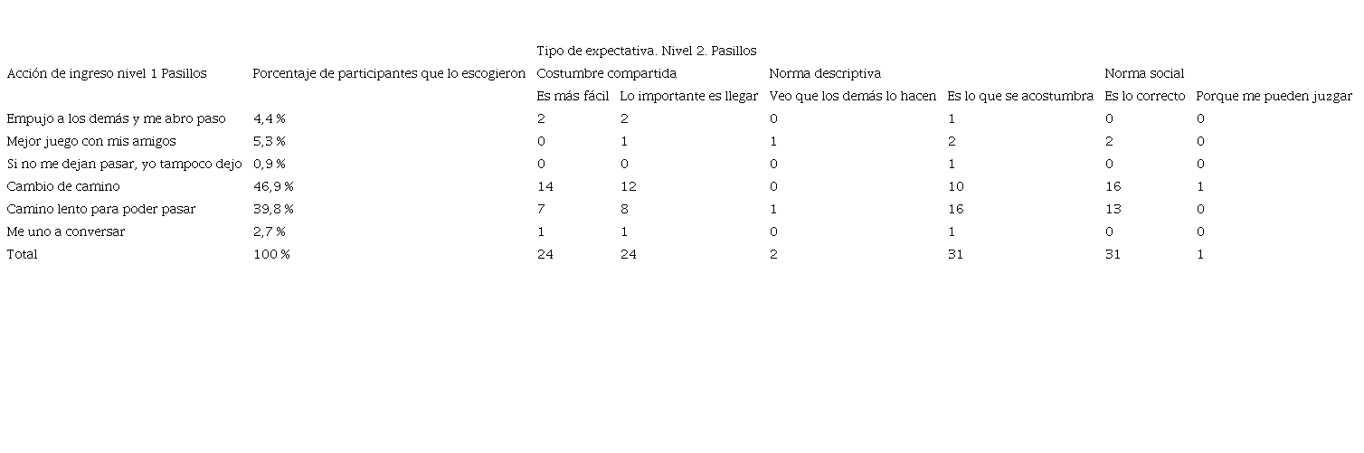 La tabla 4 presenta los datos correspondientes a los seis comportamientos que se adoptan al transitar por los pasillos de la universidad. El comportamiento que prima en la elección de los participantes es “Cambiar de camino” con un 46,9 % de elección. También es el único comportamiento de este nivel, que se clasifica como norma social, es decir, que se actúa al buscar una aprobación o desaprobación del colectivo. Esto es coherente, el ser una de las opciones con menor carga negativa en el bienestar de la comunidad, lo cual implica que uno de los elementos que influyen al seleccionarlo es el temor a ser juzgados por los demás. Sin embargo, al tomar la frecuencia grupal de las expectativas, este comportamiento también puede clasificarse dentro de una costumbre colectiva por un porcentaje mayor de participantes.