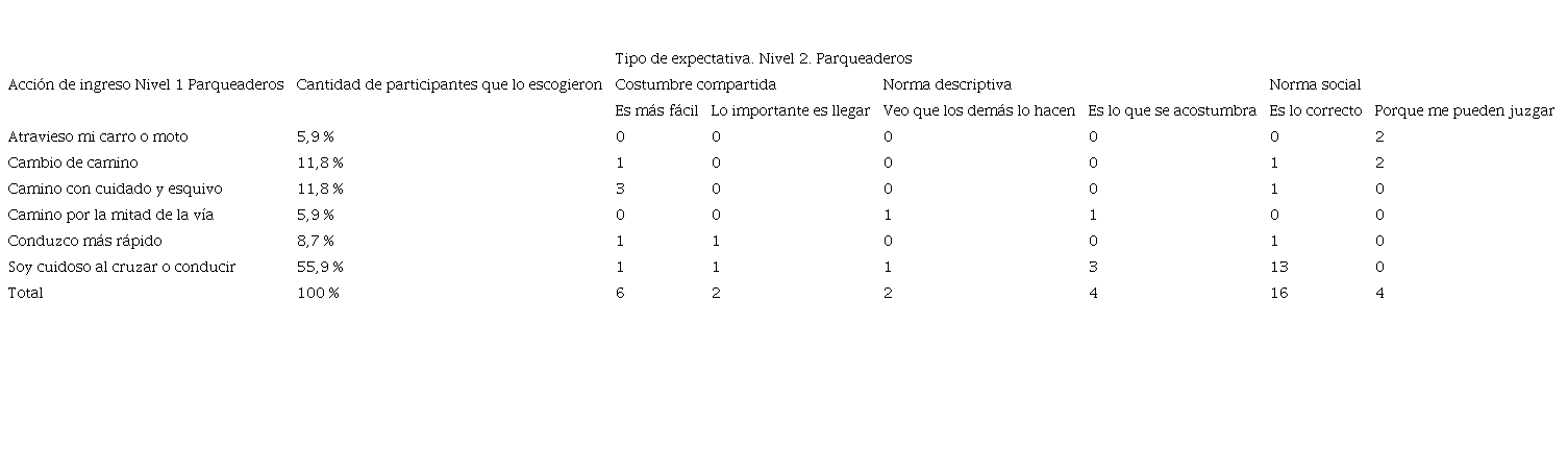 Finalmente, en el nivel, 2 al transitar por los pasillos priman los comportamientos clasificados dentro de costumbre compartida y norma descriptiva. En la tabla 5 se presenta el análisis de los seis comportamientos que se adquieren al transitar por los parqueaderos de la universidad.