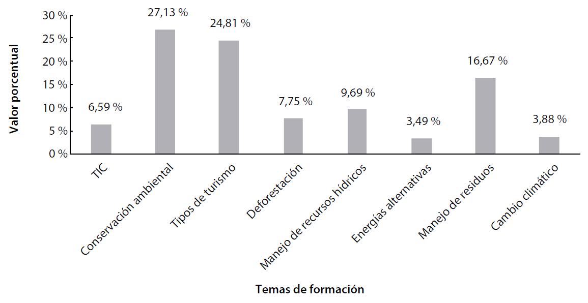 Respecto a las necesidades de formación, se indagó sobre los siguientes temas: la conservación ambiental, tipos de turismo, Tecnologías de la Información y Comunicación (TIC), energías alternativas (viento, luz solar, maderas, movimiento y caídas del agua), manejo de residuos y del recurso hídrico y cambio climático. Los resultados se presentan en la figura 9.