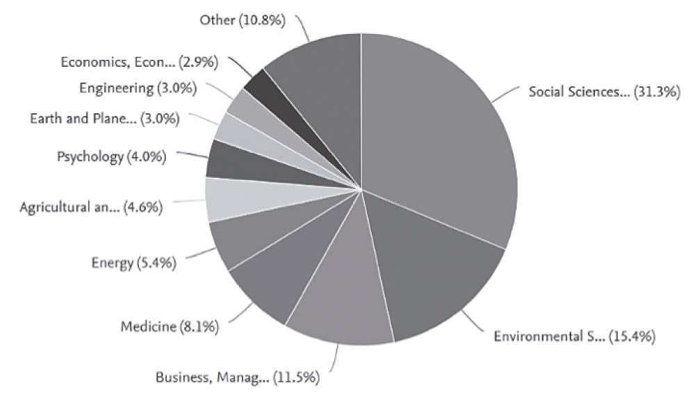 De acuerdo con las variables definidas, el estudio bibliométrico mostró un total de 630 documentos de producción científica distribuidos en las diferentes disciplinas: ciencias sociales, 31,3 %, ciencias ambientales, 15,4 %, y ciencias de los negocios, 11,5 %. En la figura 3 se indican los resultados referentes a la distribución de los estudios según el área investigativa.