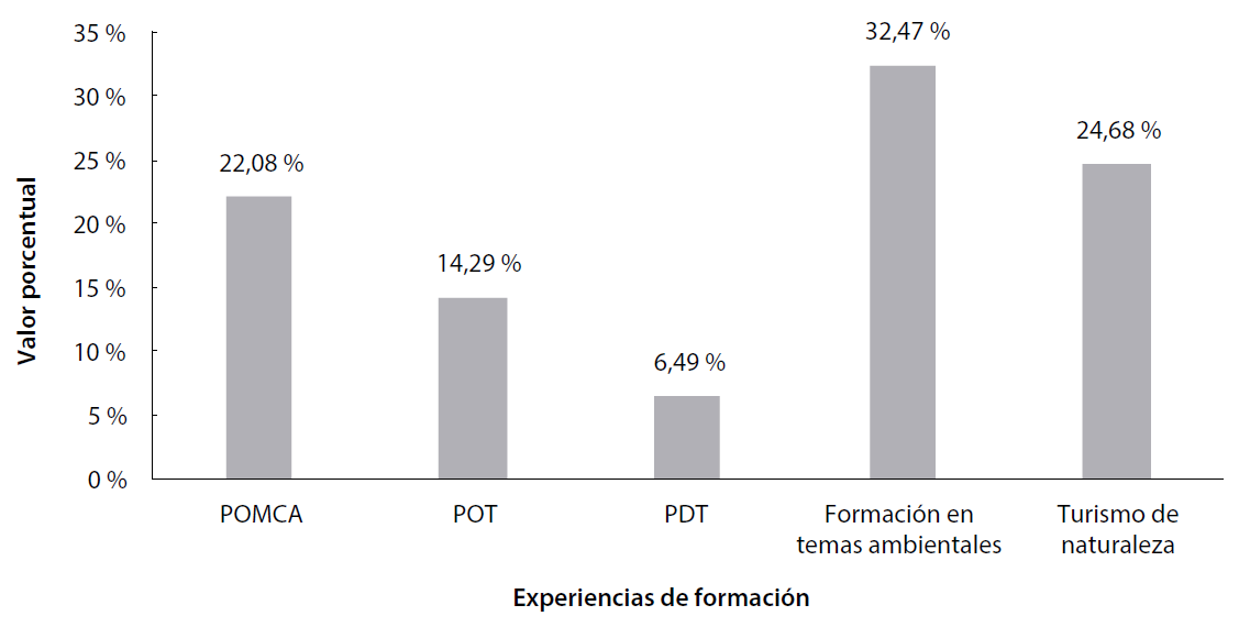 Al respecto, es significativo el interés y participación en experiencias relacionadas con la EA por parte de las 77 personas encuestadas; se destaca la formación en temas ambientales con el 32,47 %, el turismo de naturaleza aparece con 24,68 %, el Plan de Manejo y Ordenamiento de una Cuenca-Pomca 2018 es seleccionado por el 20,78 % de los participantes que han trabajado en temas relacionados con el Plan de Ordenamiento Territorial (POT) y Plan de Desarrollo Territorial (PDT). Esta intervención en la formulación de los planes de desarrollo que definen la vida en el territorio indica un alto índice de concientización acerca de la importancia de dichos planes. Asimismo, la comunidad expresa el interés por ahondar en temas de EA y en los relacionados con el turismo de naturaleza. En este aspecto, la institucionalidad ha ejercido un papel preponderante, como se indica en la figura 8.