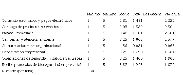 Dentro de todos los usos empresariales que se han dado a las redes sociales por medio de la tecnología móvil en tiempos de pandemia, se destacan, con una media superior, la comunicación interorganizacional de 4,36, el uso de protocolos de bioseguridad con una media de 3,68, la activación de las páginas empresariales con un 3,48 (tabla 3). Así como los menores empleos medidos por medio de la desviación estándar, aquellos valores que más se alejan de la media, como son el caso del comercio electrónico y los pagos electrónicos, con una desviación estándar de 1,49. A muchas empresas se les dificultó encontrar los medios para la recepción de los pagos y fue en un proceso lento en los cuales se fueron encontrando con dificultades y orientación tardía de las entidades financieras para acceder a estos nuevos servicios, con temores debido a los posibles fraudes que puedan presentarse por el desconocimiento de estos canales de pago. Por último, se usan redes sociales con una desviación estándar de 1,582, la opción de catálogo de productos y servicios, por cuanto las empresas no estaban listas para digitalizar por completo sus portafolios y por ende tener que empezar de cero en estas nuevas tendencias virtuales.