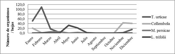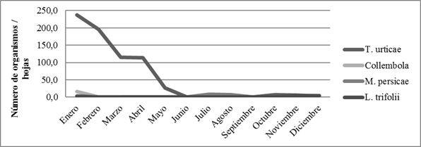 En la Figura 3 se muestra el comportamiento de las poblaciones de artrópodos en hojas de melocotonero para el campo 1 durante enero y diciembre. Es de significar, en el periodo evaluado, que T. urticae se destacó con respecto a los demás organismos existentes, seguido por Collembola, L. trifolii y M. persicae. A través de esta investigación se pueden apreciar los momentos en que aparece cada organismo en las diferentes fases del cultivo: T. urticae se manifestó de noviembre a abril; Collembola de octubre a febrero, L. trifolii de abril a julio y M. persicae de febrero a mayo.