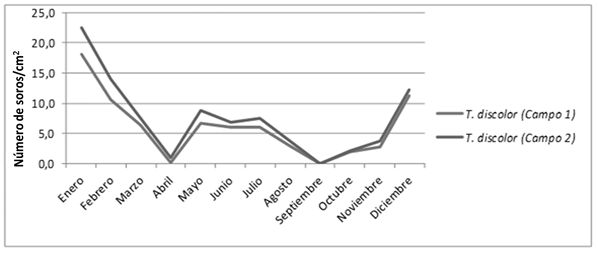 En la figura 5 se observa la incidencia de la enfermedad en las hojas existentes durante el periodo de evaluaciones. Se muestra la aparición de T. discolor para ambos campos, y se destaca una mayor incidencia de T. discolor del campo 2 con respecto al campo 1. Esta enfermedad en los dos campos estuvo presente en todas las fases del cultivo, tanto en época lluviosa como en la poco lluviosa, con mayor incidencia en enero para ambos campos.