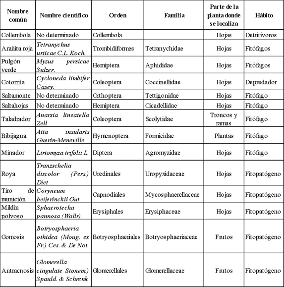 En la Tabla 1 se muestra las especies de organismos presentes en agroecosistemas de melocotonero para ambos campos, donde se pueden apreciar insectos, ácaros y hongos de diferentes órdenes y familias, así como las diferentes partes de la planta donde se localizaron y sus hábitos.