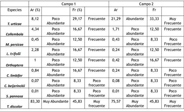 En la Tabla 2 se muestra la abundancia relativa y la frecuencia de aparición para los organismos presentes en el campo 1 y el campo 2. Los resultados obtenidos en el campo 1 para T. urticae, Collembola, M. persicae, L. trifolii, Orthoptera, C. limbifer, C. beijerinckii y S. pannosa fueron poco abundante, pues la Ar < 10; sin embargo, no fue así para T. discolor, pues se destacó con una abundancia relativa muy abundante porque su Ar > 30. Para el campo 2, los resultados coinciden con los del campo 1, excepto para T. urticae, que tiene una abundancia relativa abundante porque 10≥ Ar ≤ 30.
