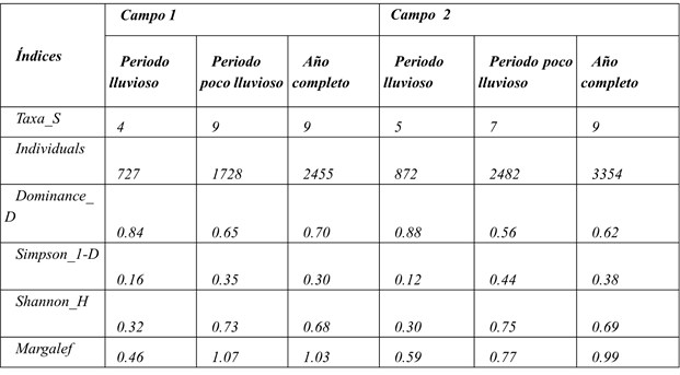 Los resultados de los índices indican que hubo variaciones en el periodo lluvioso y en el poco lluvioso para ambos campos. Además, todos los índices se mostraron con mayor diversidad en el periodo poco lluvioso para los dos campos. El campo 2 se comportó con mayor número de individuos y mayor dominancia que el campo 1, y lo mismo sucedió con los índices de Simpson_1-D, Shannon_H y Margalef. Estos resultados mostraron altos valores en el periodo poco lluvioso, lo cual resalta la baja diversidad en ambos campos.