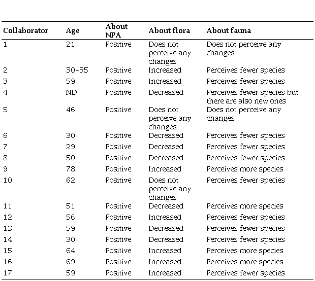 The collaborators have TEK about the fauna and flora of the NPA, supporting the related hypothesis. They identified 24 species and some ecological processes such as distribution, feeding, and behavior. Even though the TEK needs to be more detailed and profound in these matters, it demonstrates basic knowledge.