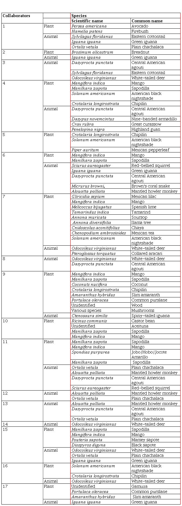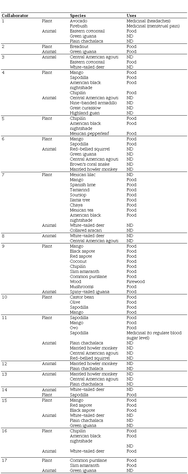 One hundred percent (n=17, N=17) of the collaborators claim to have some TEK about various species of flora and fauna present in el Zapotal (Table 3 and Table 4).