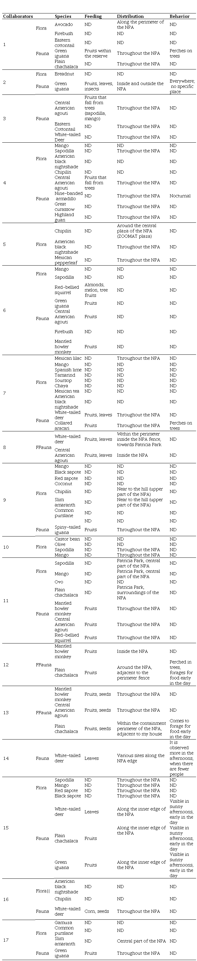 Seventy-one percent (n=12, N=17) of the collaborators identified 24 flora species in el Zapotal, recognizing their common names. The most mentioned species are mango (Mangifera indica) (seven mentions), sapodilla (Manilkara zapota) (six mentions), black nightshade (Solanum americanum) (four mentions), and chipilín (Crotalaria longirostrata) (three mentions). Eighty-eight percent (n=15, N=17) of the collaborators identified 13 species of fauna in the NPA, indicating their common names. The most mentioned animals are the agouti (Dasyprocta punctata) and the white-tailed deer (Odocoileus virginianus), with six mentions each, the plain chachalaca (Ortalis vetula) and the green iguana (Iguana iguana), with five mentions each, and the howler monkey (Alouatta palliata), with four mentions.
