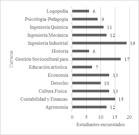 Los alumnos participaron de manera voluntaria y su edad promedio se encuentra entre los 18 y 22 años. Aproximadamente, el 54,7% son del sexo femenino y el 45,3% del masculino. El número de estudiantes por cada carrera se detalla en la Figura 2.