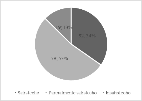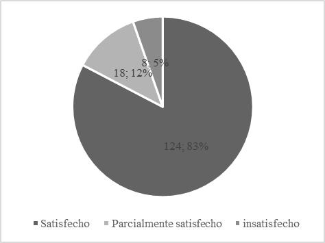 En lo referente a la adecuación de los espacios físicos de la biblioteca para el estudio y la investigación, el 79,7% de los alumnos indicó que se encuentra parcialmente satisfecho (véase la Figura 3), pues aún las condiciones físicas de las instalaciones no ofrecen el confort adecuado.