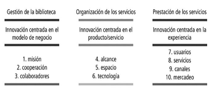 Los servicios de la biblioteca deben adoptar el modelo de innovación, para construir un centro que invite a la participación de los usuarios y que defienda como uno de sus puntos básicos la idea del cambio constante (sea en tecnologías, en las expectativas de los usuarios o en nuevos materiales de aprendizaje).