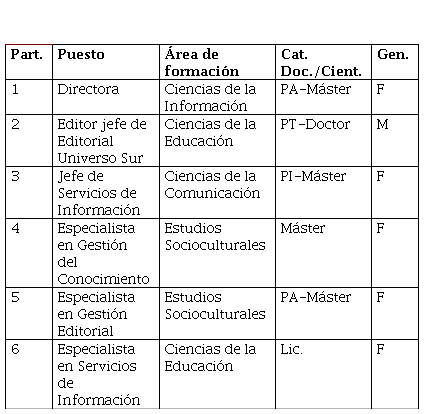 Se efectuaron seis entrevistas semiestructuradas a actores clave relacionados con los procesos del CRAI (véase la Figura 1). Se seleccionaron de forma intencional, ya que tienen dominio de las fortalezas y debilidades del centro, así como de los modos de actuación del personal bibliotecario.
