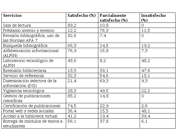 Los servicios más conocidos, y a la vez más solicitados, fueron la sala de lectura, la revisión bibliográfica —uso de las Normas APA, séptima edición— y la gestión de publicaciones científicas. Esto último se debe a los resultados alcanzados por el grupo de la Editorial Universo Sur en los últimos años, en la cual se destaca la indexación de las revistas Universidad y Sociedad y Conrado en bases de datos de prestigio regional como Scielo.