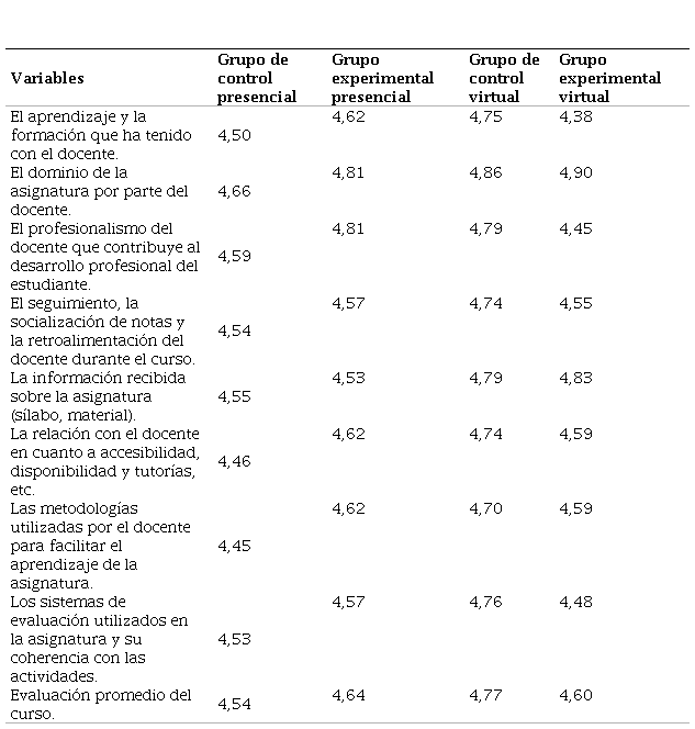 Al finalizar los cursos, se llevó a cabo una evaluación utilizando escalas de Likert de cinco dimensiones para medir la percepción de los estudiantes en: el material utilizado, la metodología aplicada, el conocimiento del docente sobre la asignatura y el desarrollo general del curso. Según los resultados, los cursos presenciales mostraron un nivel de satisfacción superior al promedio de la carrera que utilizó estrategias educativas tradicionales. En contraste, los cursos virtuales presentaron un nivel de satisfacción inferior en comparación con otras materias que mantuvieron métodos de enseñanza tradicionales.