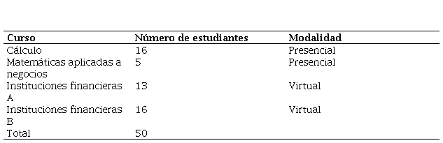 La población del estudio está compuesta por estudiantes de la Universidad Internacional del Ecuador, sede Guayaquil, y corresponde a 657 alumnos. El grupo experimental incluyó a 50 estudiantes correspondientes a cuatro cursos de la universidad en mención, como se presenta en la Tabla 1. Los resultados de la percepción de los estudiantes del experimento se comparan con los resultados del resto de la población de estudiantes de la UIDE.