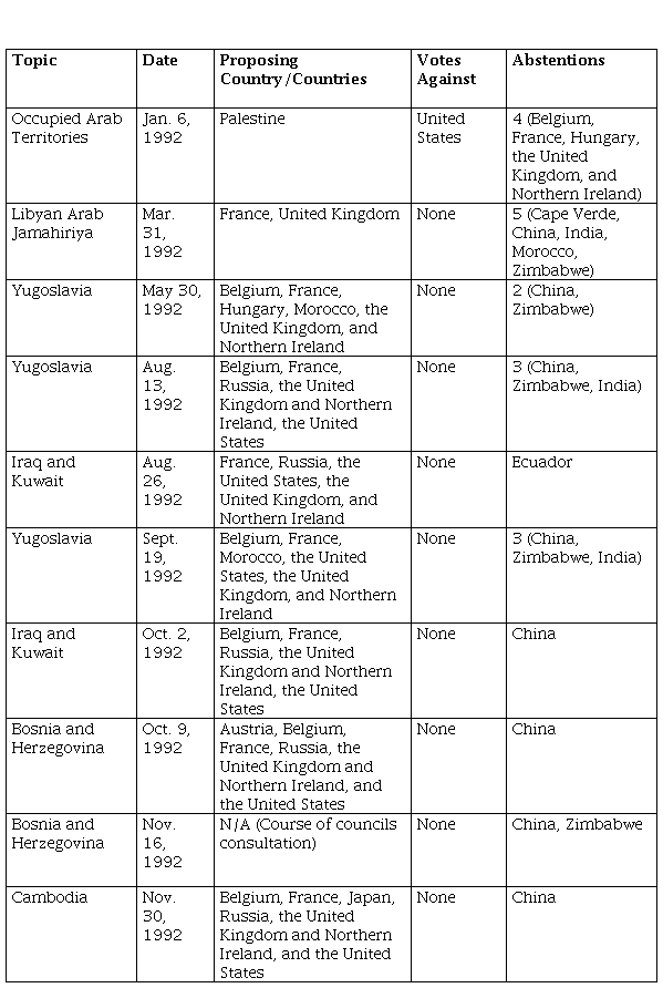 In 1992, the situation was similar, with 73 proposed resolutions, all of which were approved. Of these, 12 concerned the inclusion of new members in the UN. Table 2 shows ten instances of abstentions, mainly by China, India, Zimbabwe, and Ecuador. There was only one vote against, cast by the US, which decided not to use its veto power, and no country chose this option. Finally, all 15 members voted in favor of 50 resolutions, representing the majority of the total (Table 2).