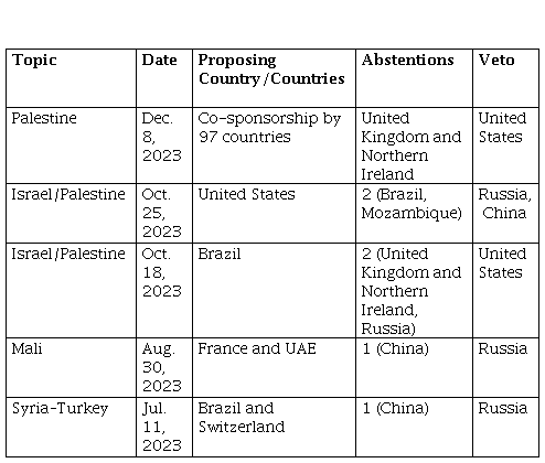 In this context, the collected data and conclusions concur with the objectives of the research. As previously mentioned, during the Cold War, 193 resolutions were vetoed, demonstrating the constant friction within the Council due to the relationship between the USSR and the US; conversely, there were only 12 vetoes in 13 years since 1990, indicating a change in power management that led to the end of the conflict. Finally, in 2023, there were five official vetoes, excluding repeated cases in which this term was not applied because the resolutions did not reach the necessary minimum. This condition pinpoints that the system is changing again, as the conflicts that dominated the Council in past years increase.
