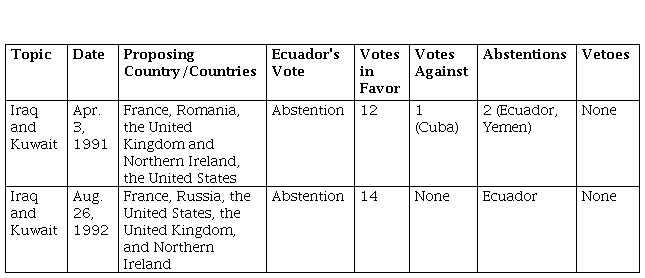 In 1991, Ecuador voted in favor of 35 of the 42 approved resolutions (excluding six with no votes), as did other members of the Council, particularly the permanent ones. In one case, Ecuador abstained along with Yemen, while Cuba voted against, and the rest, in favor. During 1992, Ecuador supported 60 of the 73 resolutions (excluding 12 on new members’ inclusion), aligning mostly with other countries, including the major powers, but abstained once, being the only country to do so against 14 affirmative votes (Table 4).