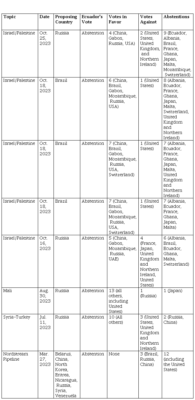 In 2023, Ecuador voted in favor of 55 of the 62 proposed resolutions, aligning with those that received majority or unanimous support. The country abstained then in eight cases, in resolutions where major powers, especially China and the US, had divergent opinions. The analysis focuses on these cases where the decisions were less clear. Table 5 shows that Ecuador's abstentions occurred in resolutions where the Security Council, particularly the major powers, were divided, reflecting Ecuador's commitment to international norms and the precepts of non-alignment.