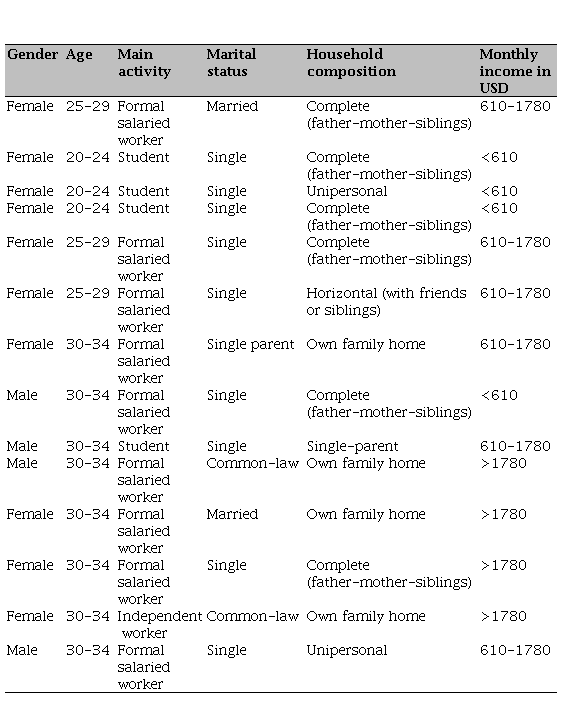 On the one hand, interviews were conducted between April and November 2017, in two stages, with experts in sustainable consumption, educators, and employees of public institutions identified on LinkedIn under the keywords “Sustainability” and “México City.” On the other hand, young people were selected through snowball sampling, originating from a convenience sample, to diversify perspectives based on gender, age, and social class.