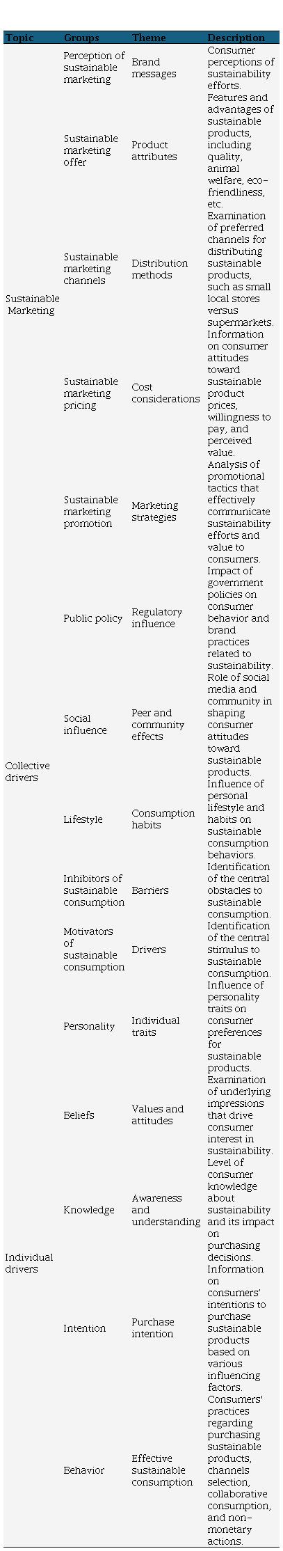 To this end, consumers’ perceptions of sustainability are analyzed, delving into consumerism (Shaw et al., 2006), social inequalities (García Martínez & Poole, 2009), and environmental issues (Freestone & McGoldrick, 2007). Lifestyles (Kotler & Armstrong, 2012) and social influence (Lee, 2008) affect collective drivers, while assessment of beliefs and knowledge substantiates individual drivers (Ajzen, 2006). Finally, the components of the sustainable marketing mix are tested.