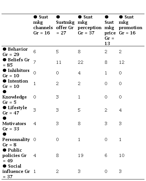 Beliefs emerge as the most significant factor in all categories, reinforcing the idea that values and awareness related to sustainability play an essential role in shaping consumer attitudes and behaviors. Public policies are also substantial, especially in the perception of sustainable marketing (Gr = 19) and promotion (Gr = 10), reflecting consumers’ expectations for stronger regulatory frameworks to support responsible consumption.