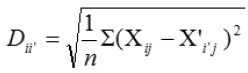 (1) Em que: Dii’: distância entre os genótipos i e i’; Xij: observação no i-ésimo genitor em referência a j-ésima característica; n: número de características em estudo. A análise de agrupamento foi realizada mediante a utilização do método hierárquico UPGMA, com base na distância euclidiana média padronizada (CRUZ; REGAZZI, 2001), utilizando os recursos computacionais do Programa Genes (CRUZ, 2006).