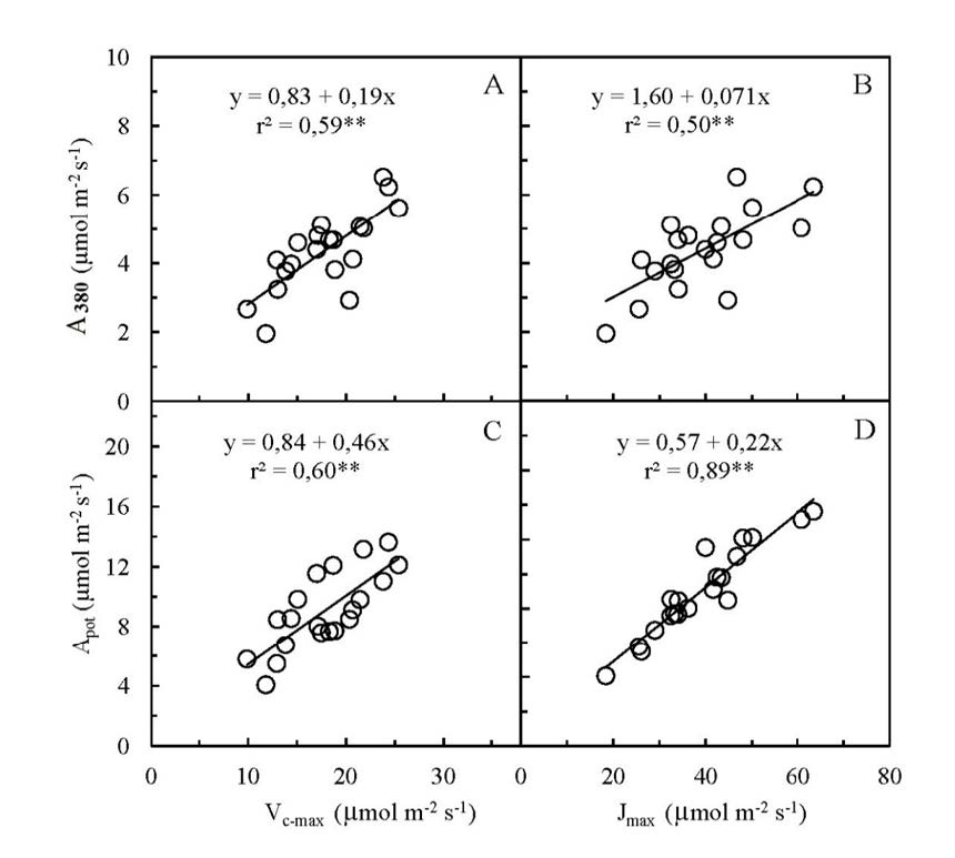 Os valores de Γ (média de 79,3 μmol mol-1) e kx (22,2 mmol m-2 s-1) relatados nesse estudo são menores do que aqueles encontrados por Marenco, Gonçalves e Vieira (2001) em árvores de diferentes fases sucessionais na Amazônia Central. A diferença pode ser atribuída ao fato de Marenco, Gonçalves e Vieira (2001) terem utilizados plantas aclimatadas a maiores níveis de irradiância. Os valores de Vc-max e Jmax correlacionaram significativamente (p < 0,01) com as taxas de fotossíntese (A380 e Apot; Figura 2). O maior coeficiente de determinação foi observado para Apot-Jmax (Figura 2D), indicando que em altas concentrações de CO2 o transporte de elétrons é mais limitante que Vc-max. A relação entre A380, Apot, Vc-max e Jmax tem sido documentada em estudos anteriores (EVANS, 1983; EVANS; TERASHIMA, 1988). O maior coeficiente de determinação para a relação A380-Vc-max (r2= 0,59**; Figura 2A) do que para A380-Jmax (r2= 50**, Figura 2B) ocorre porque Vc-max depende essencialmente dos valores das taxas de fotossíntese em baixas concentrações de CO2; já o Jmax tem como base as taxas de fotossíntese em concentração elevadas de CO2, muito acimas daquelas às quais a folha está normalmente exposta.