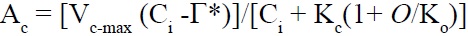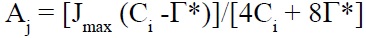 Em que: Ac e Aj são as taxas fotossintéticas líquidas limitadas pela atividade da Rubisco e taxa de transporte de elétrons (Aj), respectivamente. Γ* representa o ponto de compensação de CO2, na ausência da respiração e na presença de luz; Ci é a concentração de CO2 nos espaços intercelulares, O representa a concentração de oxigênio nos espaços intercelulares; Kc e Ko representam a constante de Michaelis-Menten da Rubisco para carboxilação e oxigenação, respectivamente. Vc-max e Jmax são frequentemente relatados na literatura a 25ºC, por isso os dados foram padronizados para esta temperatura, conforme descrito por Medlyn et al. (1999). Para determinar o efeito do horário do dia em Vc-max e Jmax, os dados de fotossíntese foram coletados nos horários entre 08h00 e 16h00, em dias selecionados ao acaso no período de setembro a novembro de 2010.