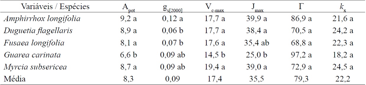 Houve diferença significativa (p < 0,05) entre espécies na fotossíntese saturada por CO2 (Apot), condutância estomática (gs[2000]), taxa máxima de transporte de elétrons (Jmax) e velocidade máxima de carboxilação da Rubisco (Vc-max); porém, não houve efeito significativo (p > 0,05) entre espécies nos valores de ponto de compensação de CO2 (Γ) e eficiência de carboxilação (kx) (Tabela 2). Em média, o valor de Apot foi 8,3 μmol m-2 s-1. Os valores de Apot nas espécies estudadas são semelhantes aos encontrados por Mendes e Marenco (2010) que relatam valores de Apot entre 7 e 9 μmol m-2 s-1 para espécies em condições naturais na mesma área de estudo. Os valores de Vc-max e Jmax obtidos neste estudo estão dentro da faixa de valores registrados para outras espécies da floresta tropical (WULLSCHLEGER, 1993; NASCIMENTO; MARENCO, 2013). No entanto, os valores deste estudo de Vc-max são baixos quando comparados com aqueles obtidos por Manter e Kerrigan (2004), que observaram valores entre 20 e 75 μmol m-2 s-1 em espécies de folhas largas. Isto indica que folhas de plantas de sub-bosque adaptadas à baixa irradiância alocam pequena quantidade de assimilados e nitrogênio para síntese de proteínas da enzima Rubisco.