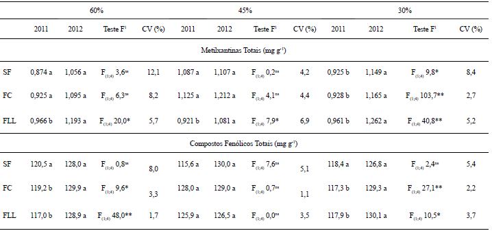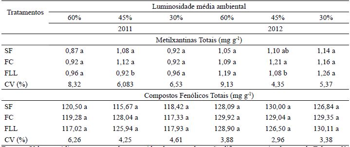 Os teores obtidos para CFT mostraram-se similares aos levantados por Borille, Reissmann e Freitas (2005), embora superiores aos de Valduga (1995), Rachwal et al. (2000) e Zampier (2001). Tais diferenças podem estar ligadas à idade das folhas, procedência, insolação e mecanismo de defesa contra herbivoria, entre outros (MISRA; MISRA; DWIVEDI, 1999). Verificou-se que os tratamentos 30% FC e 30% FLL apresentaram teores maiores no ano de 2012, comparativamente com o ano de 2011, de 10,2 e 10,3%, respectivamente. Para a luminosidade de 45%, não houve diferenciação entre os tratamentos na comparação entre as duas estações de crescimento (Tabela 2).