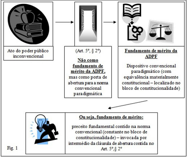 Defendemos que, por intermédio da ADPF, utilizando-se do preceito fundamental contido nessa cláusula de abertura constitucional (Art 5º, § 2º) - que serve como uma “porta” ao “bloco de constitucionalidade”23, se aferiria a compatibilização da norma pátria ao dispositivo convencional paradigmático, o qual integra o referido bloco. Dito de outro modo, não se estaria a confrontar a norma infraconstitucional ao § 2º, mas à norma internacional constante no bloco, utilizando-se como fundamento não a violação do § 2º, mas a norma material constante no tratado, conforme exposto na figura exposta na figura abaixo: